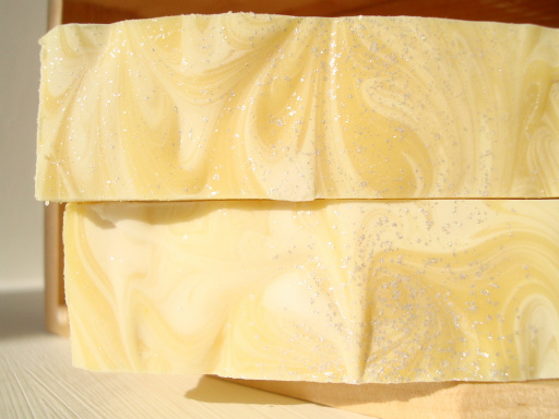 I used the same recipe I used for my Fresh Orange soap - Golden Olive Oil, Shea Butter, Cocoa Butter and lots of pure tussah silk. I blended Lemon fragrance oil with May Chang (or Litsea Cubeba) essential oil to give a good, strong, sherberty lemon fragrance that sticks (as we all know that Lemon essential oil sadly tends to disappear in cold process soaps).
